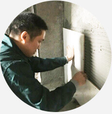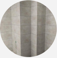 先將墻面拉毛、找平使用東方雨虹專用瓷磚 粘貼劑。墻面與瓷磚面分別進(jìn)行橫縱拉槽進(jìn) 行鋪貼有效的防止瓷磚脫落及空鼓